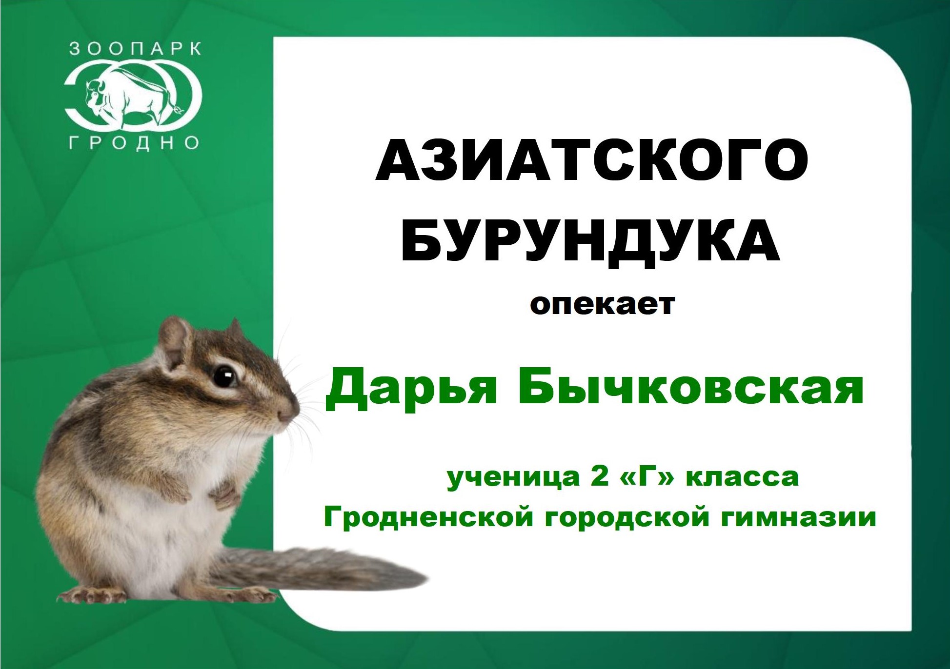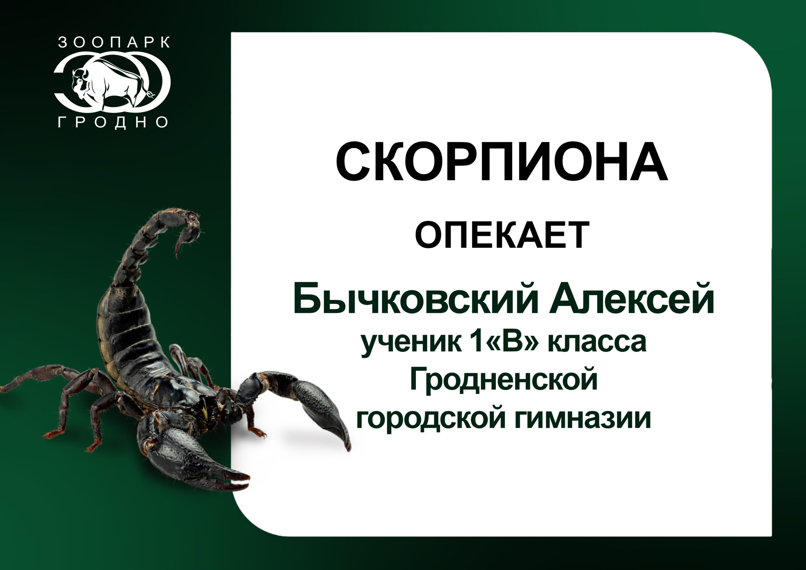 Гродненский зоопарк выражает благодарность Алексею Бычковскому, ученику 1 “В” класса Гродненской городской гимназии, за участие в программе “Опека” и поддержку наших питомцев. Опубликовано: 24.02.2026