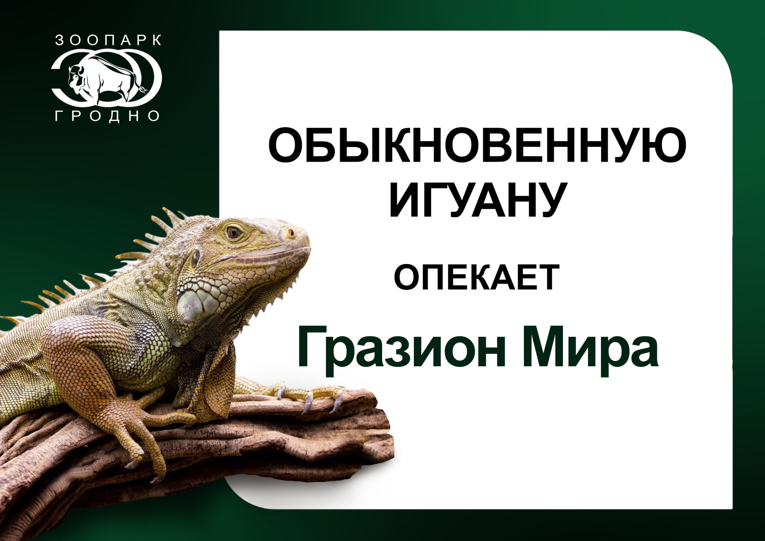 Игуану Асю опекает Мира Гразион Опубликовано Автор Гродненский зоопарк выражает благодарность Мире Гразион за участие в программе “Опека” и поддержку наших питомцев. Опубликовано: 21.01.2026 YouTube Instagram Telegram TikTok